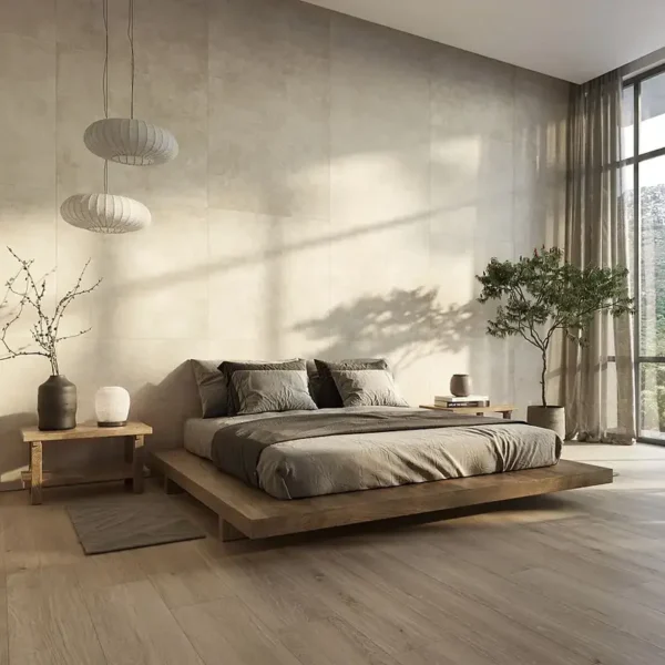 Se trata de azulejos de tonos neutros y acabados lisos que transmiten serenidad y limpieza visual. Este estilo es el más apropiado para quienes desean un dormitorio moderno y despejado.